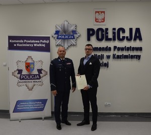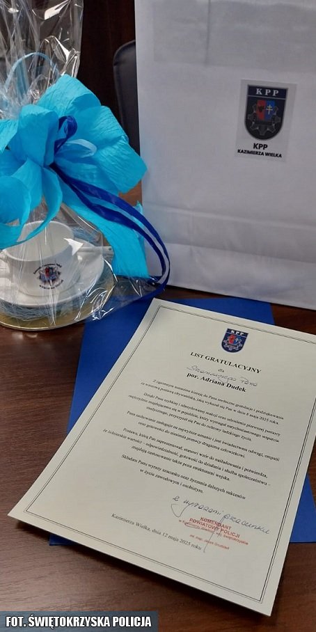 Wczoraj w Komendzie Powiatowej Policji w Kazimierzy Wielkiej miało miejsce spotkanie, które było wyrazem uznania dla odwagi i zdecydowania. Komendant jednostki, mł. insp. Jacek Grudzień, osobiście podziękował żołnierzowi rezerwy pasywnej porucznikowi Adrianowi Dudkowi za godną podziwu postawę obywatelską.