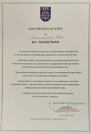 Podczas wczorajszego spotkania Komendant Powiatowy Policji podkreślił znaczenie tej postawy, mówiąc: „Dzięki szybkiej i zdecydowanej reakcji oraz udzieleniu pierwszej pomocy mężczyźnie znajdującemu się w pojeździe, który wymagał natychmiastowego wsparcia medycznego, przyczynił się Pan do ochrony ludzkiego życia. Pana zachowanie zasługuje na najwyższe uznanie i jest świadectwem odwagi, empatii oraz gotowości do niesienia pomocy drugiemu człowiekowi.”