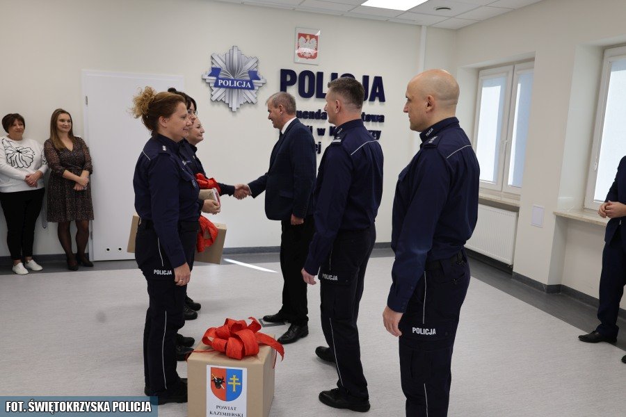 W uroczystości uczestniczyły policjantki, pracownice cywilne, kierownictwo jednostki, Starosta Powiatu Kazimierskiego Pan Jan Nowak, Wicestarosta Powiatu Kazimierskiego Pan Marek Olejarski, Przewodniczący Rady Powiatu Pan Jerzy Bojanowicz oraz Członek Zarządu Powiatu Pan Sebastian Cichy.