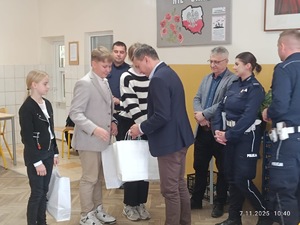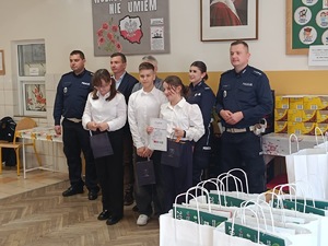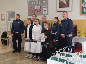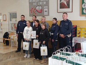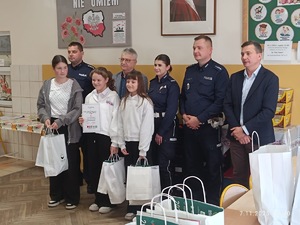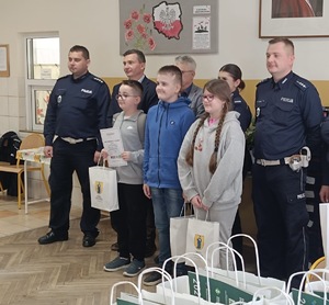 Uczestnikom konkursu nagrody wręczyli dyrektor Szkoły Podstawowej nr 3 w Kazimierzy Wielkiej Pan Robert Głogowiecki, Kierownik KRUS w Kazimierzy Wielkiej Pan Mariusz Szmitke, Naczelnik WRD Komendy Powiatowej Policji w Kazimierzy Wielkiej asp. szt. Daniel Szastak oraz policjanci kazimierskiej drogówki st.asp. Daniel Kumor i st. post. Klaudia Derlecka.